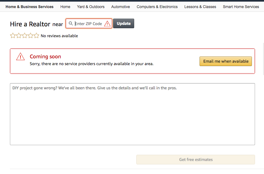 Tucked into the website’s Home and Business Services section, where users can receive quotes from professionals for various services including assembling new purchases or setting up new technology, Amazon now lists a “Hire a Realtor” webpage, seen below.