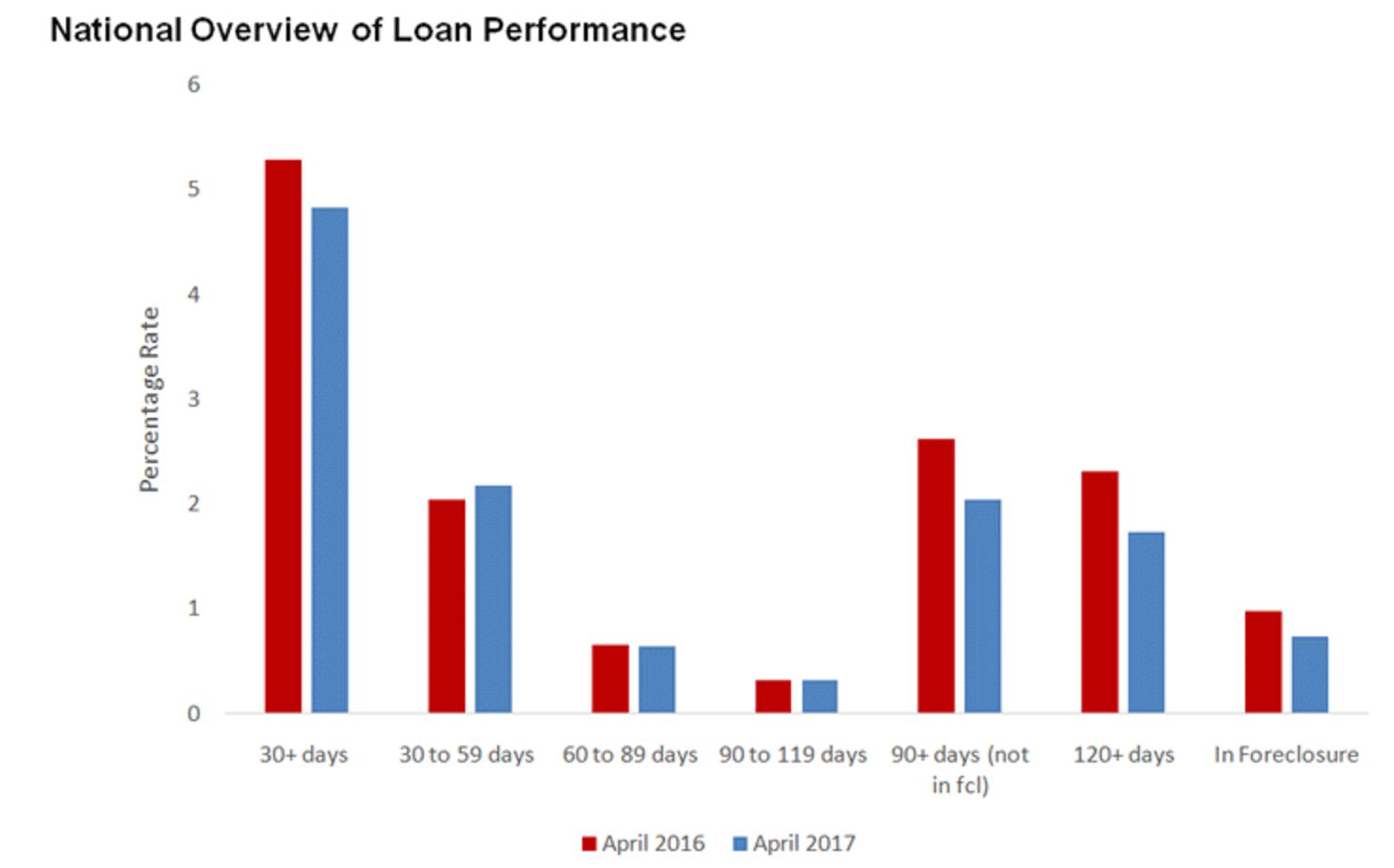 Early-stage delinquencies, mortgages 30 to 59 days past due, increased slightly to 2.2%, up from 2% in April last year. The chart below shows loan performance across all loan types.